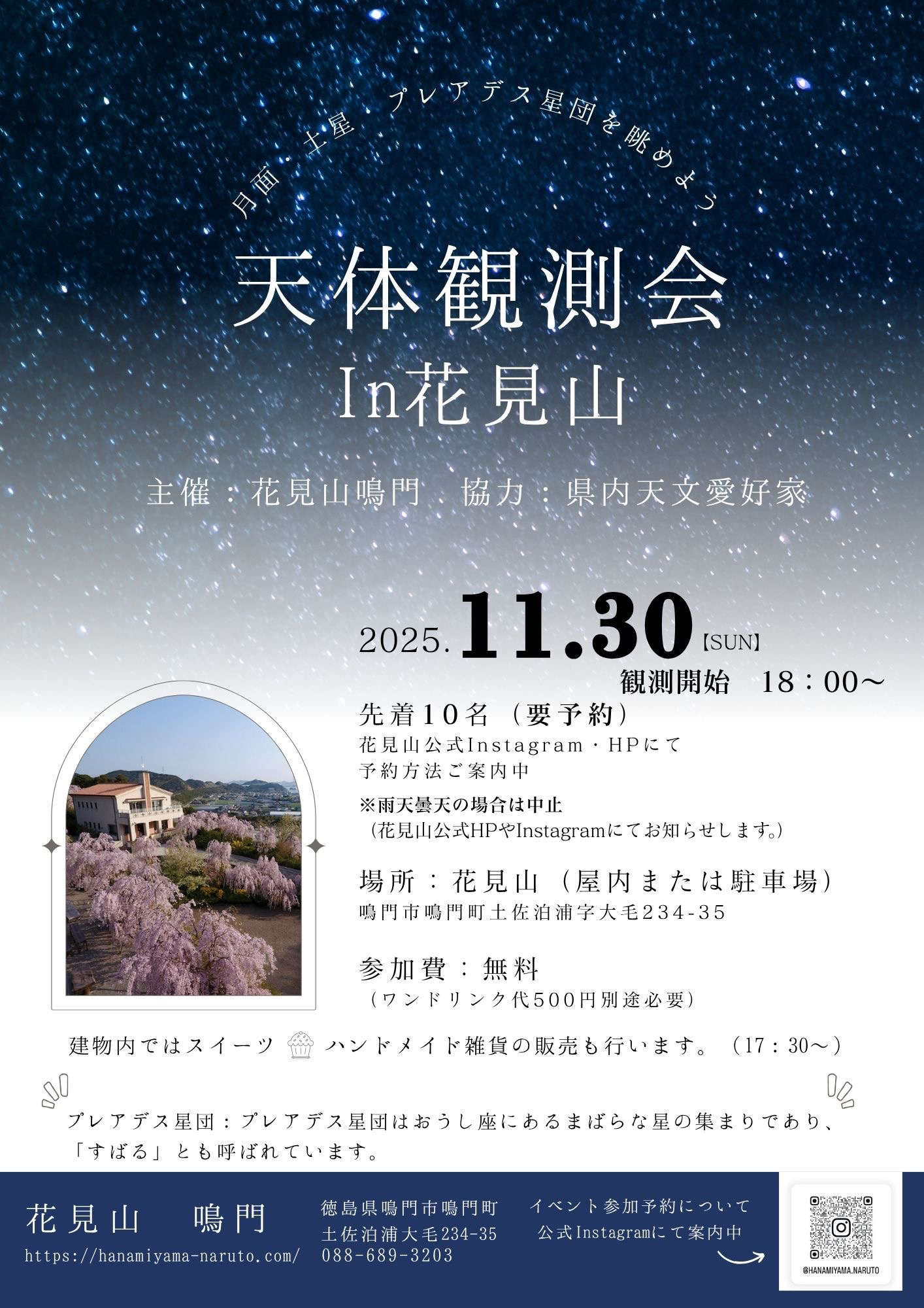 この度、花見山にて「月面・土星・プレアデス星団」の観測会を開催いたします。